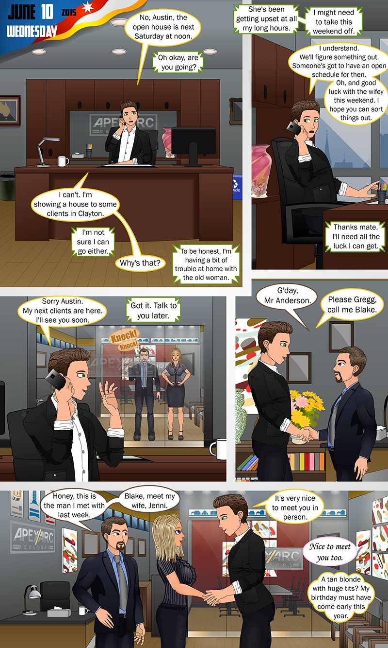 “It’s just another day at the office for Blake. Although he gets a pleasant surprise when he meets a new busty, blonde client. Will he be able to contain himself around her? More importantly, what’s in store for his changes?”