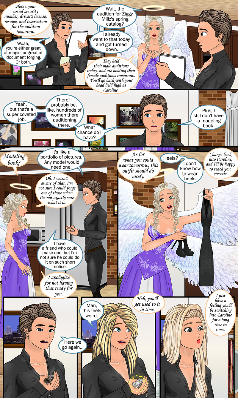 “Lorraine sets her son/daughter to work on building a new career as Caroline. Fortunately, Lorraine has planned ahead… Mostly.”