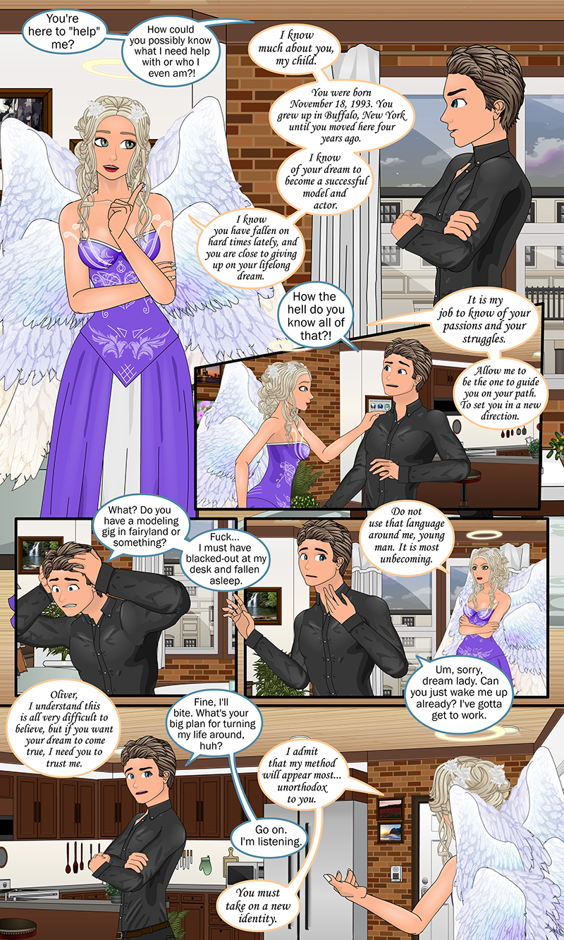“Oliver is understandably very suspicious of some so-called magic person who suddenly appeared in his home. However, those wings and that halo don’t look fake, so maybe she’s the real deal… What could her ‘unorthodox method’ be for fixing Oliver’s problem?”
