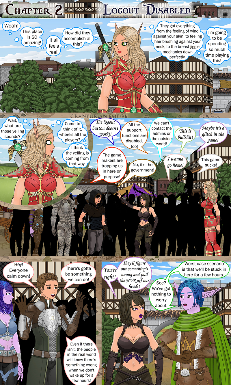 “Cynthel is amazed at how real Mysteria looks and feels. Before he can even get a whole minute to enjoy it, trouble is brewing. Word is spreading that the log out buttons are all disabled, as well as the support system that could have been used to call for help from the admins. But surely, they’ll be fine if people in the outside world take the NVR’s off of them.”